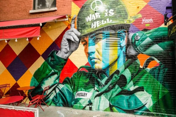 Nessa obra, Elvis que aparece como um militar com capacete indicando que “a guerra é o inferno”.