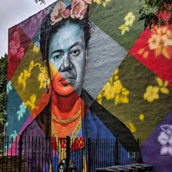 Entre dois prédios no Brooklyn, os famosos pintores mexicanos Frida Kahlo e Diego Rivera (que por anos foram um casal) são uma pessoa.